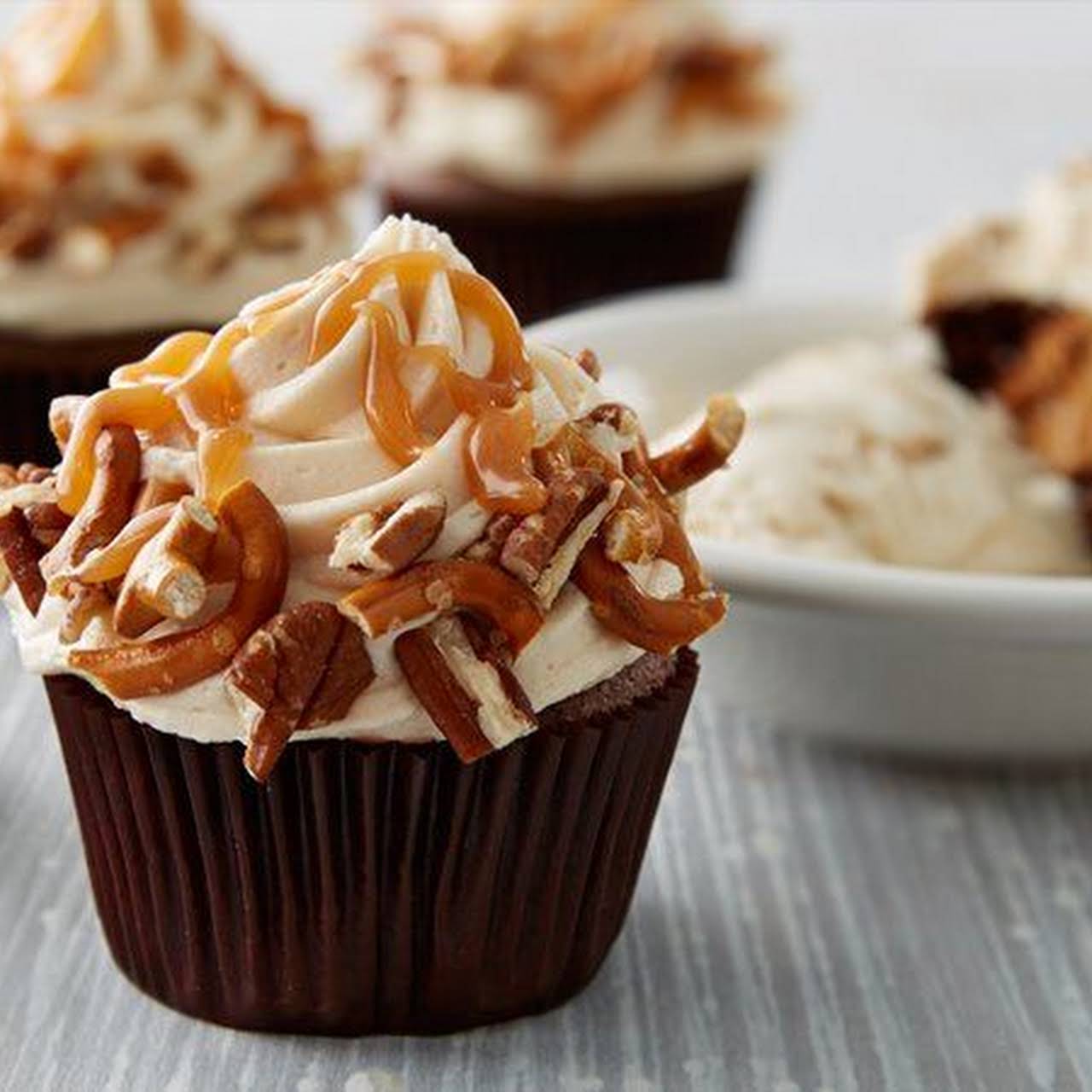 Sky-high Salted Caramel Chocolate Cupcakes subsequently Devils Food Cake Mix, Oil, Water, Eggs, Cream Cheese, Sweetened Condensed Milk, Kosher Salt, Butter, Powdered Sugar, Vanilla, Caramels, Milk, Kosher Salt, Chopped Pecans, Crushed Pretzels, Caramel Topping, Kosher Salt