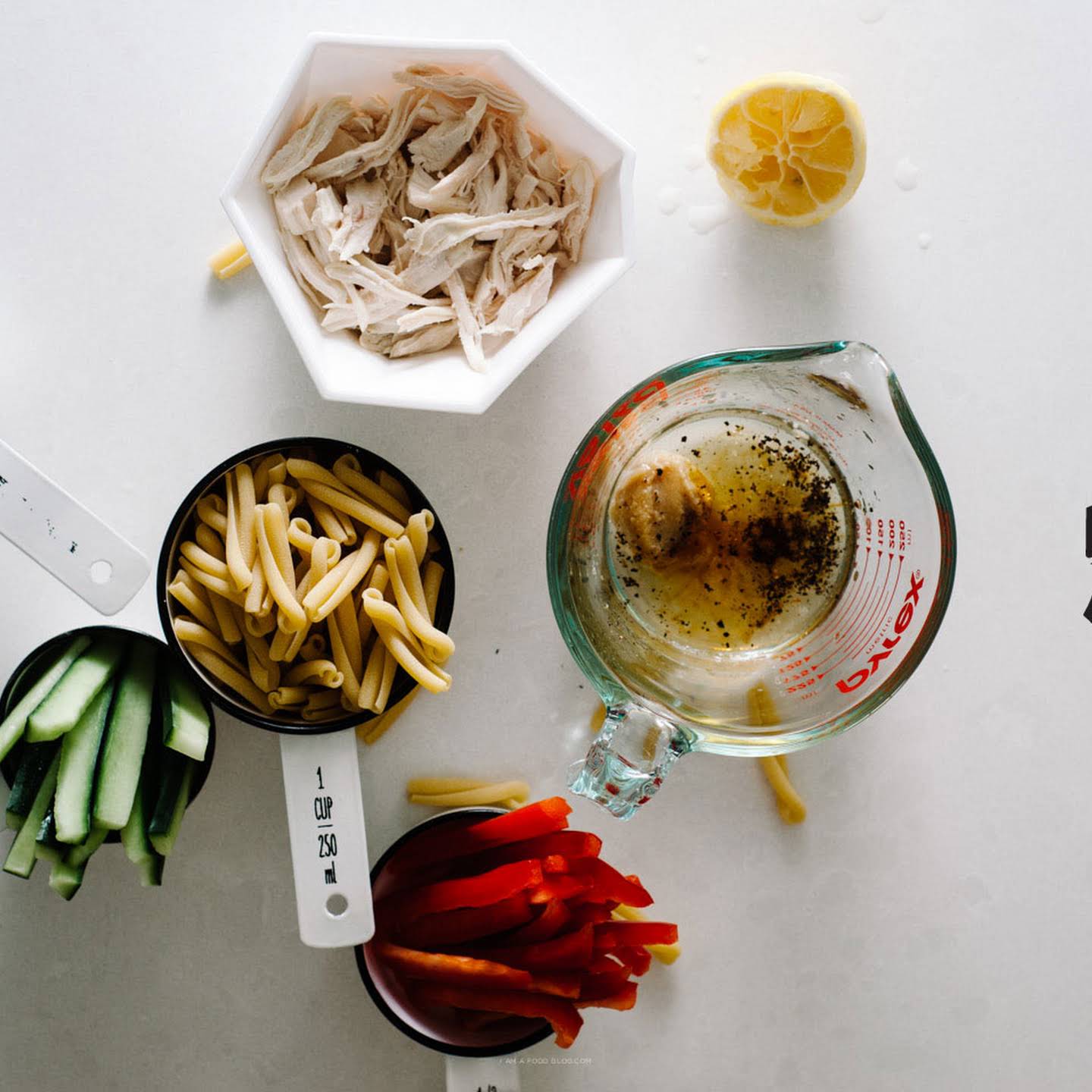 Miso Pasta Salad taking into account bearing in mind Pasta, Red Peppers, Sliced Cucumbers, Chicken, Salad Dressing, Sliced Green Onions, Sesame Seeds, White Miso Paste, Rice Vinegar, neuter sexless Oil, Sesame Oil, Lemon Juice, Pepper
